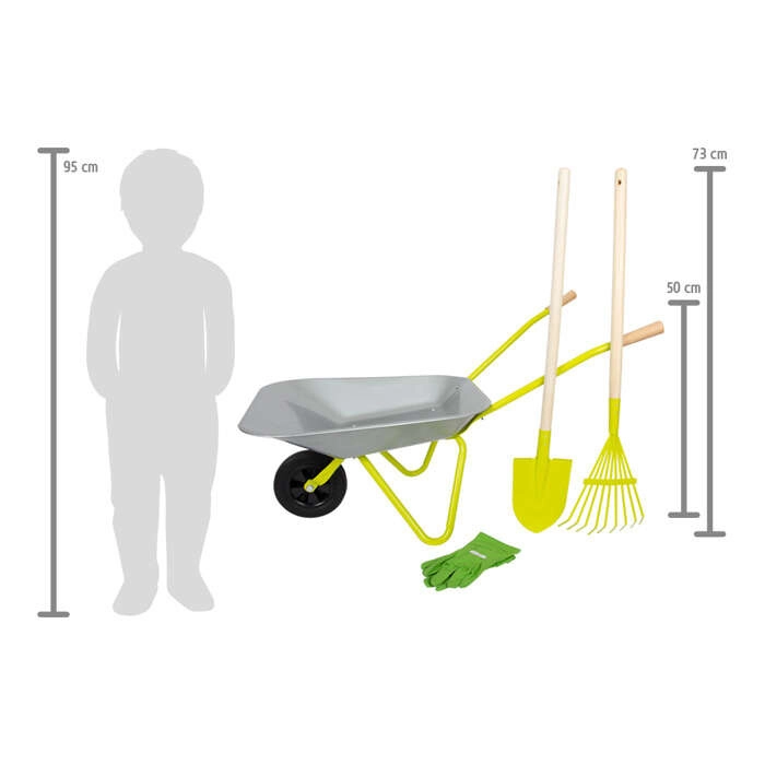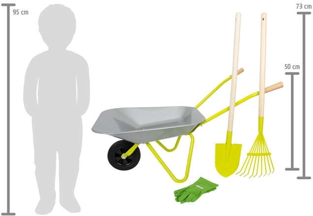 - Dimensioni pratiche: carriola ca. 79 × 36 × 50 cm, altezza delle maniglie 50 cm; lunghezza di pala e rastrello ca. 73 cm.