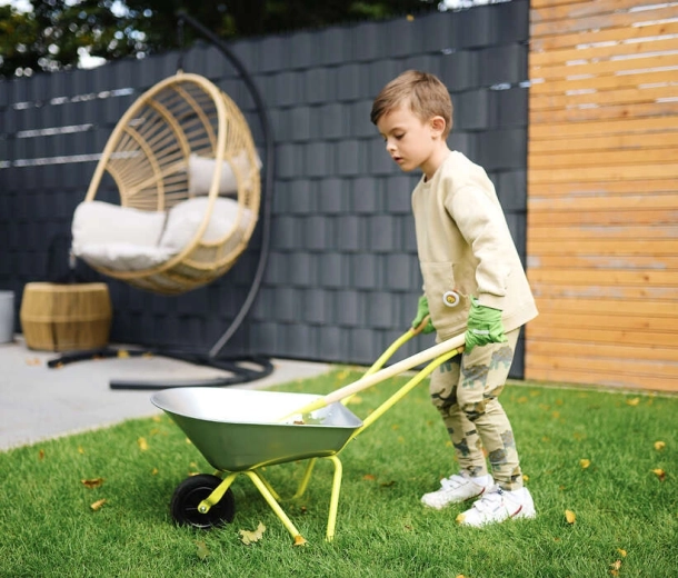 Vasca in metallo, telaio robusto e design a una ruota agevolano le manovre. I bambini possono trasportare facilmente foglie, terra e piccoli attrezzi grazie a un volume di circa 10 litri e a una portata fino a 15 kg.