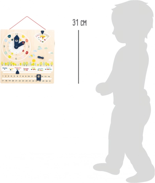 La chiara tavoletta in legno combina orologio, calendario e indicatori del meteo. Elementi colorati e pittogrammi nitidi facilitano la comprensione e incoraggiano un apprendimento divertente ogni giorno.