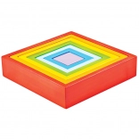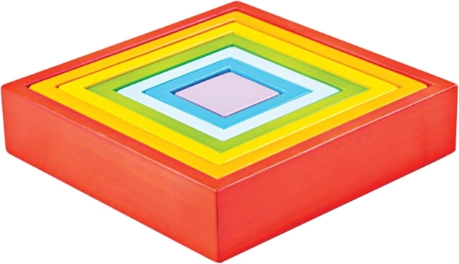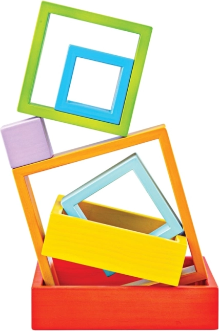 Questo set versatile offre combinazioni infinite – senza istruzioni, solo con la fantasia. I bambini possono inserire i quadrati in ordine di grandezza, costruire torri, creare mosaici e cornici colorate per le proprie creazioni e, dopo il gioco, decorare anche la stanza. Il legno robusto e i bordi lisci assicurano una presa piacevole e una lunga durata del giocattolo.