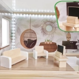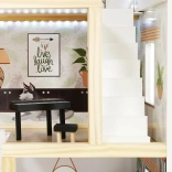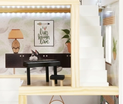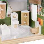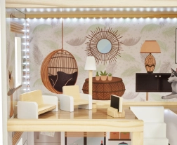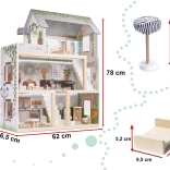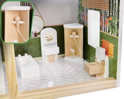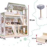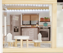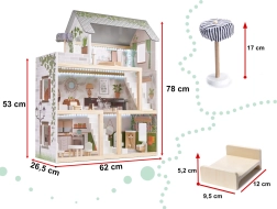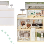 La casetta in legno per bambole LULILO Floro è creata in stile boho, rendendola non solo bella ma anche funzionale. Con i suoi tre piani e la terrazza spaziosa, offre ampio spazio per diversi scenari e giochi. La casa è dotata di quattro stanze: cucina, bagno, soggiorno e camera da letto, dove ogni stanza è riccamente arredata come in una vera casa.