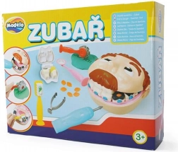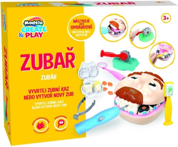 - Strumenti dentistici (trapano, pinza, specchietto, spazzolino), stampo per denti, pasta modellabile multicolore