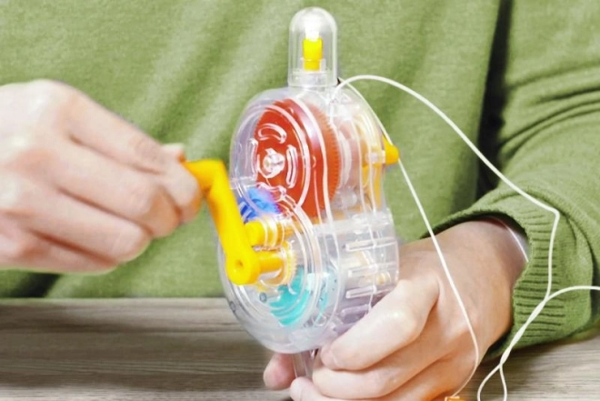 Gira la manovella e produci elettricità con la tua forza. Il corpo trasparente mostra il lavoro degli ingranaggi in tempo reale.
