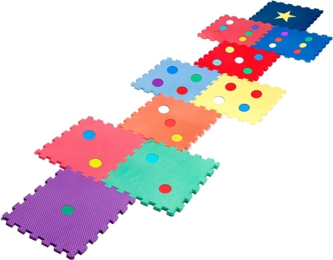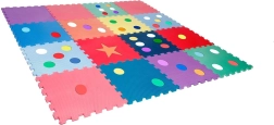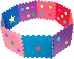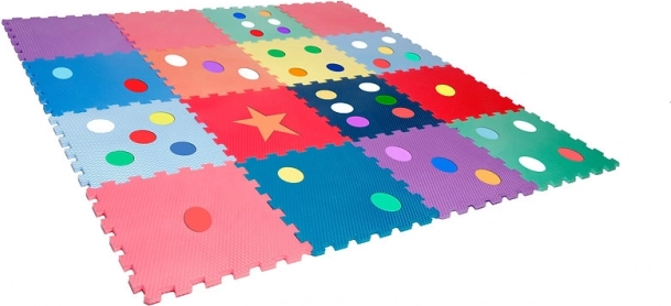I colori vivaci e le forme (pois, stella) stimolano la percezione sensoriale e lo sviluppo della motricità fine e grossa. La schiuma assorbe gli urti e protegge dal freddo del pavimento.