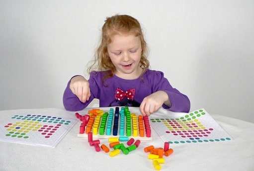 Questo mosaico motorico colorato è un aiuto ideale per lo sviluppo della motricità fine e della logica dei bambini dai 3 anni in su. I bambini inseriscono i piolini nei fori seguendo i modelli o la propria fantasia, esercitando così pazienza, concentrazione e precisione.