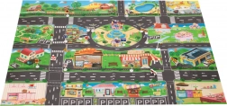 Il tappetino raffigura un paesaggio urbano con strade, edifici e parchi, promuovendo l'immaginazione e la creatività dei bambini nel gioco con i giocattoli.