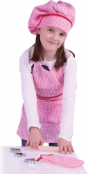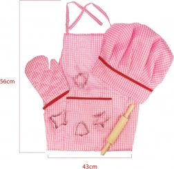 Il set include tutto il necessario per le prime esperienze di cucina e pasticceria: grembiule 56 × 43 cm, cappello da cuoco, guanto da forno, mattarello in legno e formine. Ideale per la cucina giocattolo e per la pasticceria assistita.