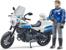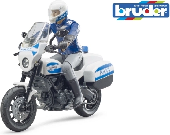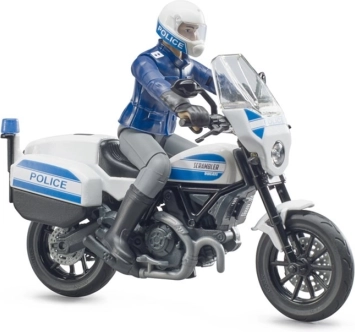 La moto della polizia DUCATI Scrambler di Bruder è un modello curato per piccoli e grandi appassionati dei servizi di emergenza. La moto ha manubrio sterzante per facili manovre e cavalletto ribaltabile per un appoggio stabile. La figura del poliziotto ha arti snodati, per posizionarla in assetto di guida o in piedi accanto al veicolo.