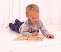 Questo alfabeto in legno con immagini è un giocattolo educativo ideale per i bambini in età prescolare. I piccoli imparano a riconoscere le forme delle lettere e il loro ordine corretto mentre allenano la motricità fine inserendo i pezzi nella tavola. All’interno di ogni lettera si trova un’immagine a tema di un animale che inizia con quella lettera, favorendo il vocabolario e un apprendimento naturale.