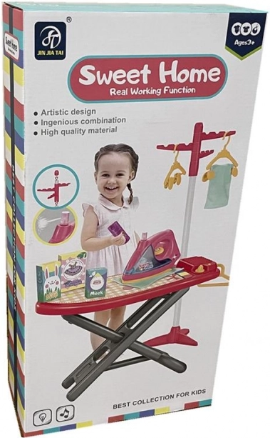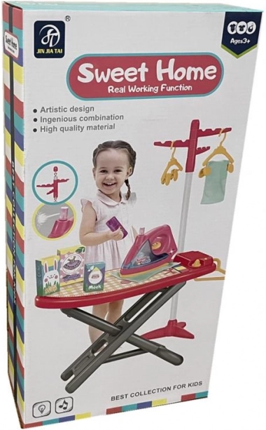Asse da stiro in plastica con ferro, appendiabiti, grucce e altri accessori per piccole casalinghe. Altezza dell’asse 50 cm. Il ferro ha effetti sonori e luminosi.