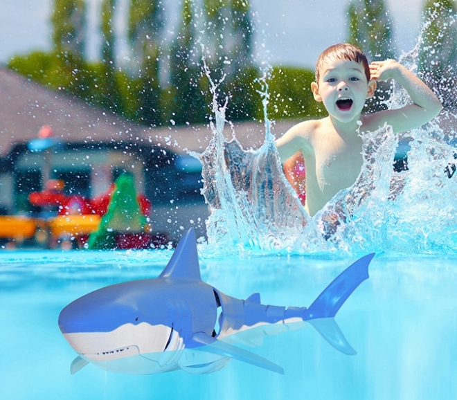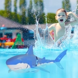 Con un telecomando nero con pulsanti blu, puoi controllare facilmente lo squalo e i suoi movimenti.