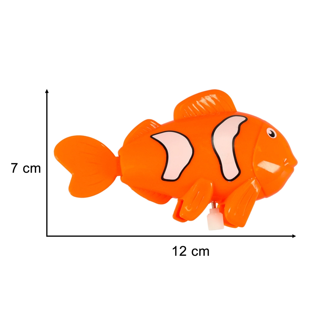 Un meccanismo meccanico con chiavetta fa girare coda e pinne, così il pesciolino galleggia e nuota davvero in acqua – senza batterie e senza ricarica.