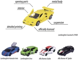 Nella confezione troverai una selezione di vetture leggendarie: ALFA ROMEO 4C Spider, LAMBORGHINI Countach LP 400, LAMBORGHINI Huracán Avio, LAMBORGHINI Urus e ALFA ROMEO Giulia. Grazie alle parti snodate e alle sospensioni funzionanti, la guida è fluida e realistica. Perfetto per bambini dai 3 anni in su e come elegante aggiunta alla tua collezione.