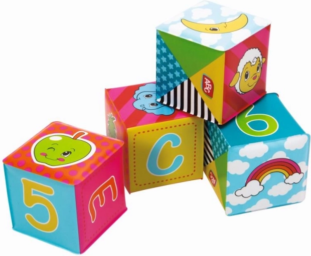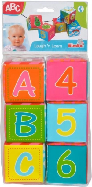 Set di 6 cubi morbidi ideati per i più piccoli. Ogni cubo misura 8 x 8 cm e presenta vivaci colori e immagini di animali, numeri e lettere.