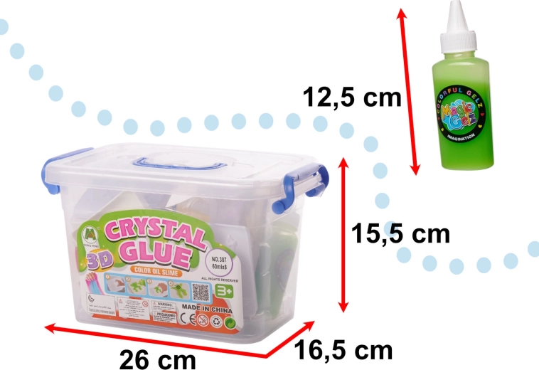 Puoi versare il gel anche direttamente nella soluzione e creare forme uniche e personalizzate. Questa attività sviluppa creatività, pazienza e motricità fine ed è un ottimo relax anche per gli adulti. L’intero set è riposto in un robusto contenitore di plastica per un facile trasporto e stoccaggio.