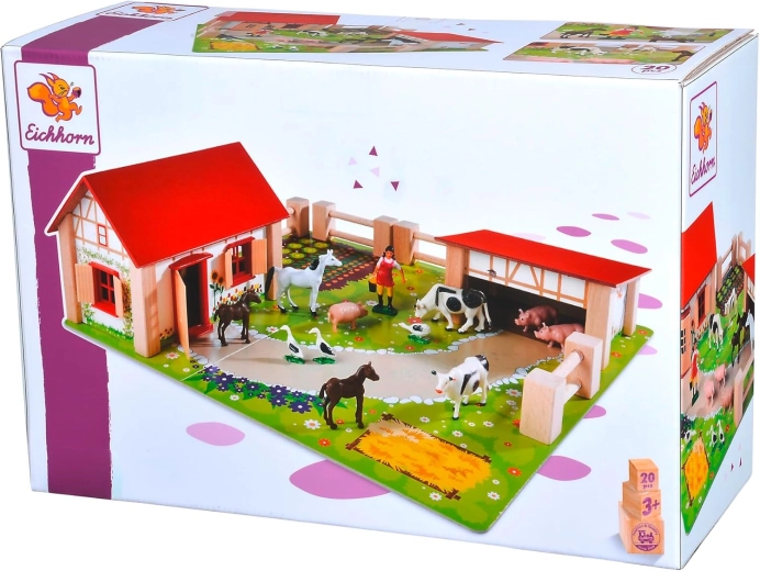 La fattoria in legno EICHHORN entusiasmerà ogni piccolo contadino. Il set comprende una casetta con tetto rosso, stalla, recinti e dettagliate figurine di animali, tra cui cavallini, mucchette, maialini e oche. È incluso anche un tappetino colorato con strade e orto, che guida facilmente i bambini nella creazione di scene e storie personali. La solida struttura in legno e i materiali resistenti garantiscono lunga durata e gioco sicuro.