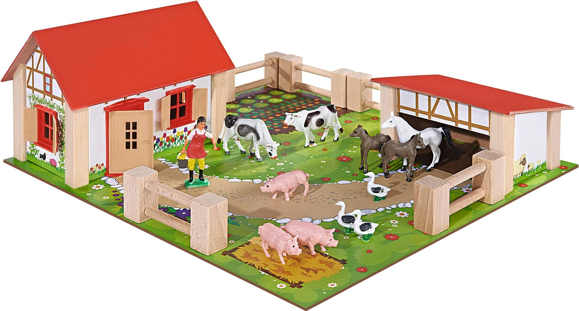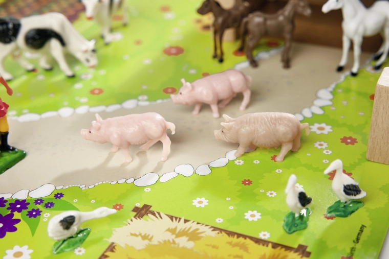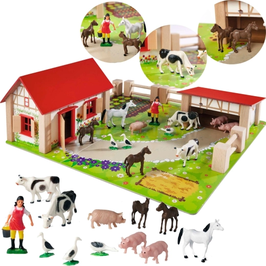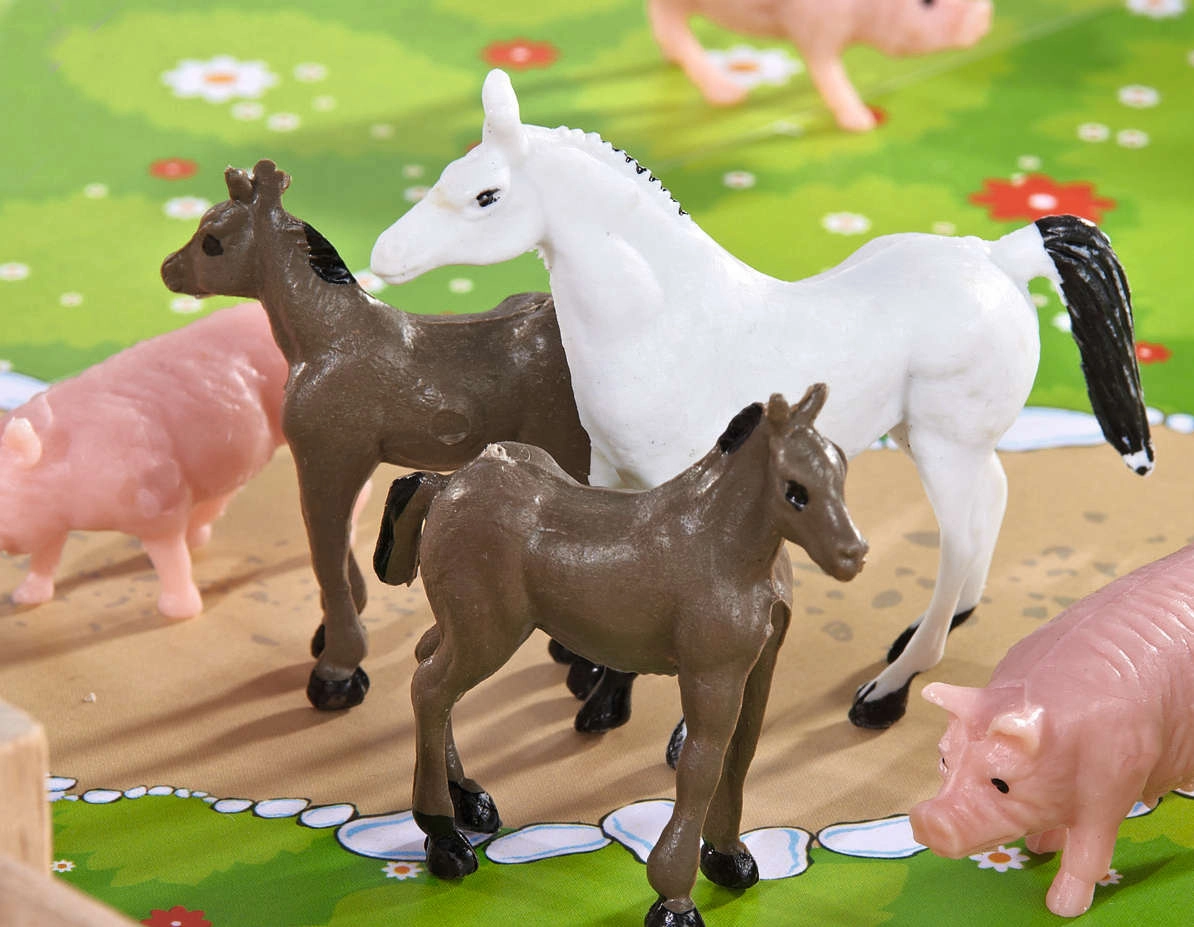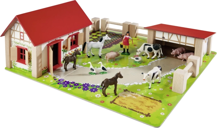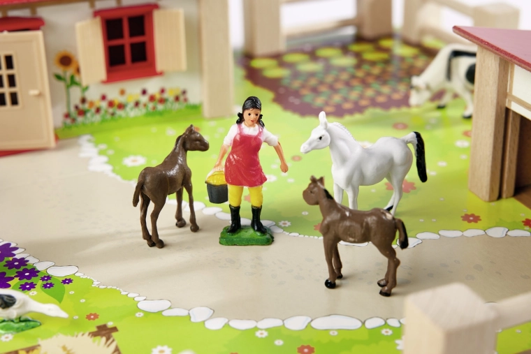 Cavalli, mucche, maialini, oche e la custode stimolano la fantasia, aiutano i bambini a riconoscere le specie animali e sviluppano abilità sociali attraverso il role-play.