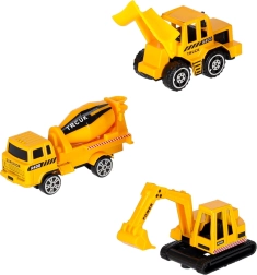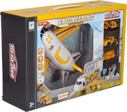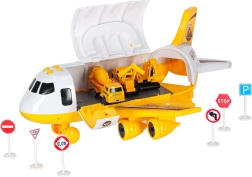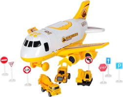 Il set include tre veicoli da costruzione gialli – escavatore con braccio mobile, autobetoniera e bulldozer – più 7 segnali stradali. Tutto entra all’interno dell’aereo. Il giocattolo ha ali rimovibili per risparmiare spazio e una maniglia per un facile trasporto.