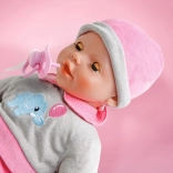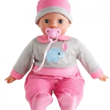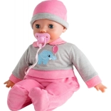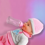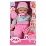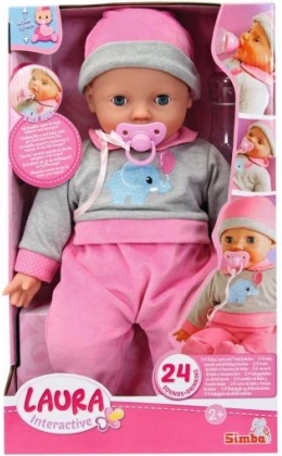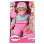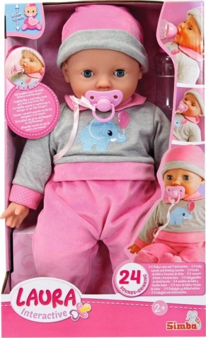 Bambola interattiva Laura porta divertimento e cura ai bambini con un corpo morbido, occhi chiudibili e capacità di emettere 24 suoni infantili. Include biberon e ciuccio.
