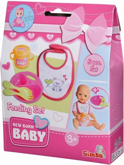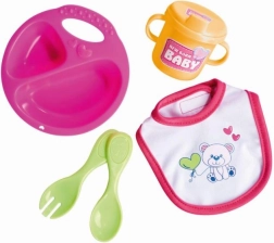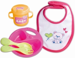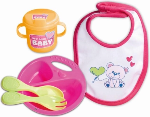Grazioso set pappa per bambole NEW BORN BABY include 5 pezzi – piatto, cucchiaino, forchettina, tazzina e bavaglino – per bambole da 30–43 cm. Il set è leggero e facilmente lavabile, ideale per il gioco della pappa e per lo sviluppo della motricità fine.