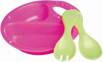 Stoviglie in plastica leggere dalle forme arrotondate e posatine ergonomiche favoriscono il gioco autonomo e la motricità fine.