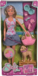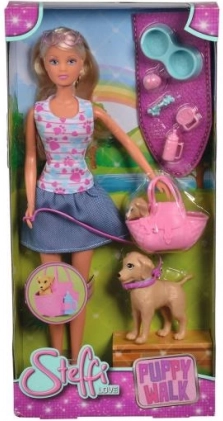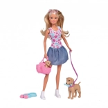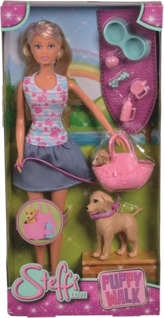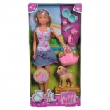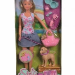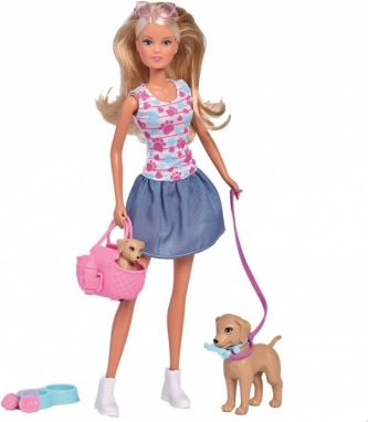 Bambola Steffi Love in passeggiata con due adorabili cuccioli. Questa bambola include abiti alla moda e accessori essenziali per la cura degli animali, creando una fantastica opportunità per i bambini di sviluppare la loro immaginazione e amore per gli animali domestici.