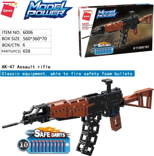 Il set di costruzione Qman Model Power 6006 è ispirato al famoso fucile d'assalto Kalashnikov. Una volta montato, consente ai bambini di sparare in sicurezza freccette in schiuma smussate. Disponibile sotto forma di mattoni di plastica colorati, compatibili con Lego, Sluban, Cobi e altri marchi.