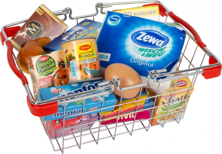 Divertente e resistente cestino della spesa per bambini dai 3 anni, riempito con riproduzioni di prodotti di uso quotidiano. Favorisce il gioco del negozio, sviluppa fantasia e abilità sociali. Struttura in metallo con paraspigoli in plastica per maggiore sicurezza e lunga durata.