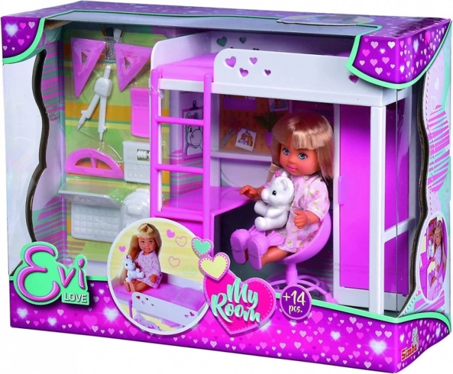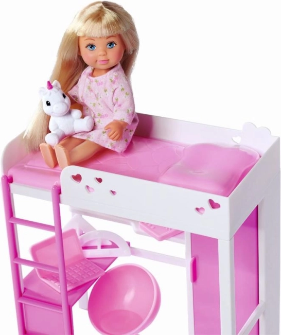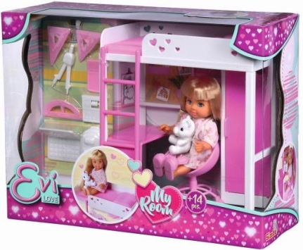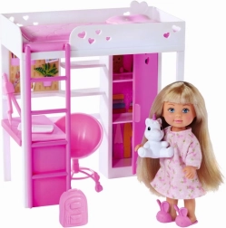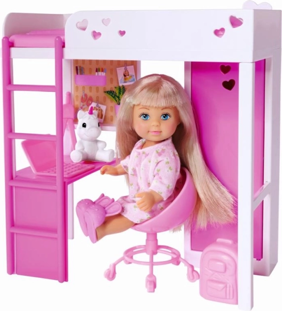Scopri la cameretta incantata dove la bambola Evi trascorre il tempo giocando, studiando e riposando. Il moderno letto a soppalco con scala fa risparmiare spazio e sotto ospita un comodo angolo studio con scrivania e spazio contenitivo. Il tutto in tonalità bianco–rosa con delicati cuoricini che faranno felice ogni piccola designer.