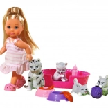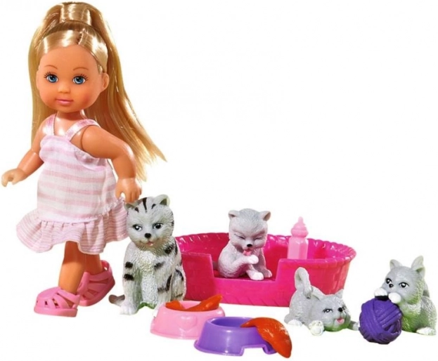 Il set include una bambola con lunghi capelli biondi e un elegante vestito rosa. Sono inclusi anche adorabili gattini giocattolo che ispirano giochi di cura.