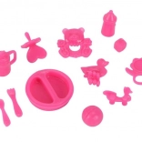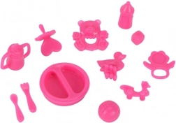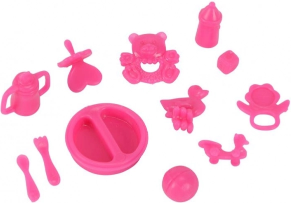 Il set include vari giocattoli di plastica rosa come piatti, posate e bottiglia, che arricchiscono l'esperienza di gioco.