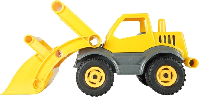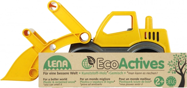 Robusto caricatore per bambini LENA ECO in plastica riciclata con aggiunta di legno, offre meccanismo funzionante, benna manovrabile e cabina ribaltabile per una manipolazione facile. Ideale per piccoli costruttori dai 2 anni.