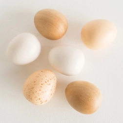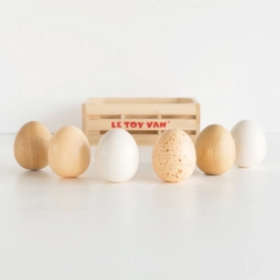 Sei uova di legno in una solida cassettina con manici offrono un'esperienza autentica di cucina e shopping. L'ampliamento ideale per la cucina dei bambini e il banco vendita.