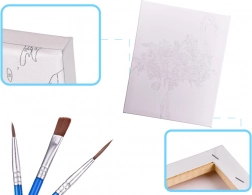 - Include tutto il necessario: tela rinforzata con cornice in legno, una serie di vernici etichettate con numeri corrispondenti e tre pennelli di diverse dimensioni.