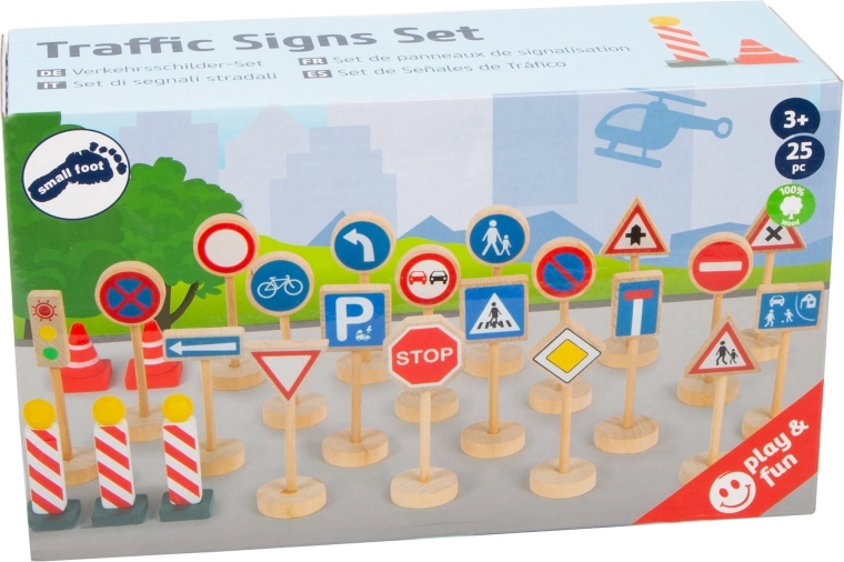 Questo set in legno di alta qualità offre tutto ciò di cui i bambini hanno bisogno per creare il proprio mondo del traffico. Include segnali come STOP, senso obbligato a sinistra, divieto di sorpasso, strada con diritto di precedenza, attraversamento pedonale, parcheggio, nonché semaforo, coni e barriere. I pezzi hanno un'altezza di circa 3–11 cm, si impugnano bene e, grazie alle basi stabili, stanno saldamente in piedi.