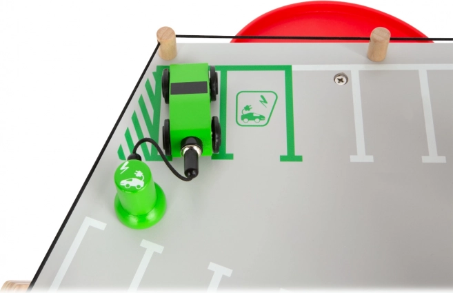 Il set include 2 macchinine, pompa, stazione di ricarica, rampa sollevabile, autolavaggio con spazzole e tre sbarre. I piani hanno un parapetto in gomma contro la caduta dei veicoli e le superfici sono riccamente segnate con icone e segnaletica stradale. La struttura è solida, resistente e sicura, richiede un montaggio semplice con istruzioni illustrate.