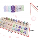 - Contenuto della confezione: base in legno, pesciolini in legno, canna da pesca magnetica, cifre e simboli matematici 1–10, 10 forme geometriche, 50 anelli per contare.