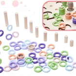Dieci pioli e un set di anelli colorati aiutano a comprendere il concetto di quantità. Il numero di anelli sul piolo corrisponde alla cifra sulla tavola – un apprendimento semplice e intuitivo del primo conteggio.