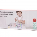 I bambini inseriscono cifre colorate e forme geometriche negli appositi incastri sulla tavola. Nell'abbinamento allenano la motricità fine, la discriminazione visiva e il pensiero logico.