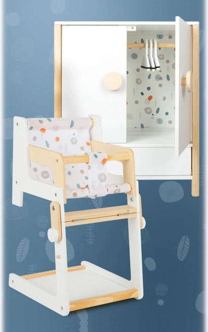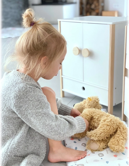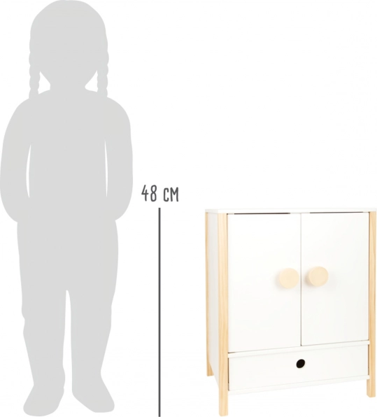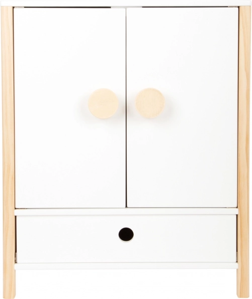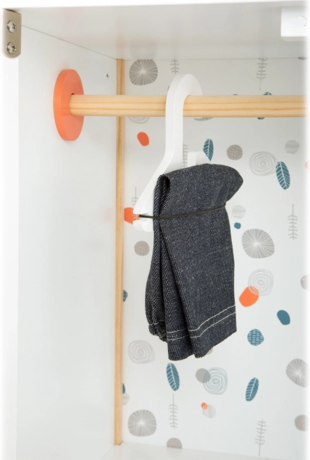 La robusta struttura in legno, la lavorazione stabile e i bordi arrotondati garantiscono un gioco confortevole e sicuro. L’armadio incoraggia autonomia, senso dell’ordine e stimola l’immaginazione nel gioco di cura delle bambole.