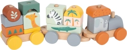 Il trenino in legno Safari è illustrato in colori pastello con motivi di animali safari, rendendo il giocattolo visivamente attraente per i bambini piccoli.