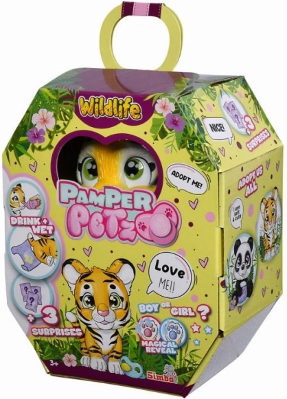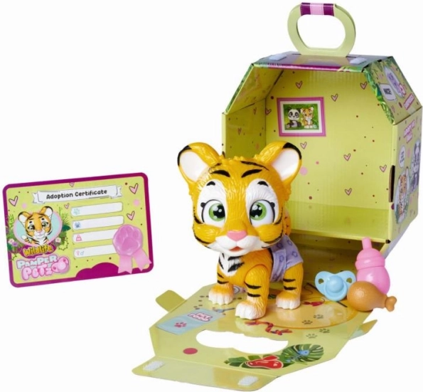Scopri la magia con il delizioso tigrotto Pamper Petz! Questa tigre interattiva con pannolino è progettata per permettere ai bambini di esplorare il mondo della cura degli animali e vivere la gioia di adottare un nuovo amico. La tigre ha funzioni che le permettono di bere acqua dal biberon e fare pipì nel pannolino, che cambia colore a seconda dell'umidità.