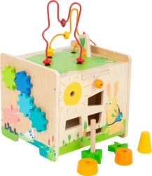 I bambini scopriranno un ricco ventaglio di attività: inserimento delle forme, rotazione di colorati ingranaggi, scorrimento di elementi nel labirinto, suonare lo xilofono e una divertente carota – una vite da avvitare che sviluppa la presa e la pazienza. La struttura in legno robusto e i colori tenui con illustrazioni di animaletti colpiscono al primo sguardo.