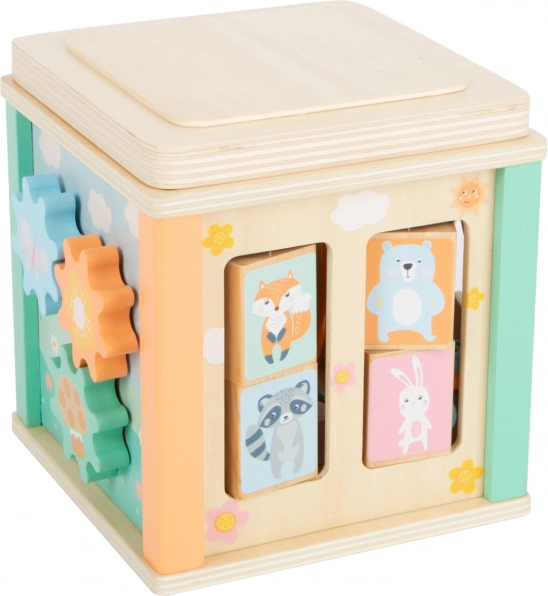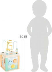 Questo cubo motorico in legno nei moderni colori pastello della linea “Pastel” colpisce per l'elevata percentuale di legno, i simpatici motivi di animali e l'accurata lavorazione. I bambini possono giocare su tutti e cinque i lati e allenare naturalmente la coordinazione mano-occhio, la pazienza e la percezione spaziale.
