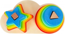 La Torre di inserimento Duha Duo è un giocattolo in legno progettato per supportare l'apprendimento e lo sviluppo dei bambini. Offre la possibilità di ordinare pezzi per dimensione e forma - stelle e cerchi - in colori vivaci. Questo giocattolo stimola il riconoscimento dei colori e le abilità di coordinamento mentre i bambini costruiscono l'arcobaleno in modo divertente.