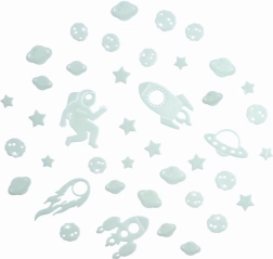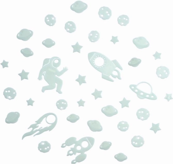 Con questo set spaziale creerai facilmente un cielo notturno incantato direttamente nella cameretta. Basta esporre le decorazioni alla luce e il loro effetto fosforescente garantirà una lieve luminescenza che stimola la fantasia e favorisce un sonno tranquillo.