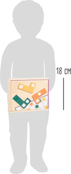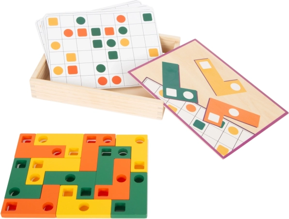 Un intelligente gioco di logica in legno per bambini dai 4 anni che sviluppa immaginazione spaziale, pensiero logico e motricità fine. Con l’aiuto di tasselli colorati con fori, i bambini compongono le soluzioni seguendo i modelli sui cartoncini e allenano il riconoscimento di colori e forme. Il tutto è riposto in una robusta scatola di legno con coperchio scorrevole – ideale sia per giocare a casa che in viaggio.