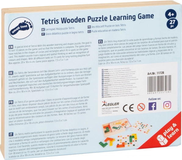 - 27 tasselli, 15 cartoncini con 30 modelli, scatola di legno con coperchio scorrevole