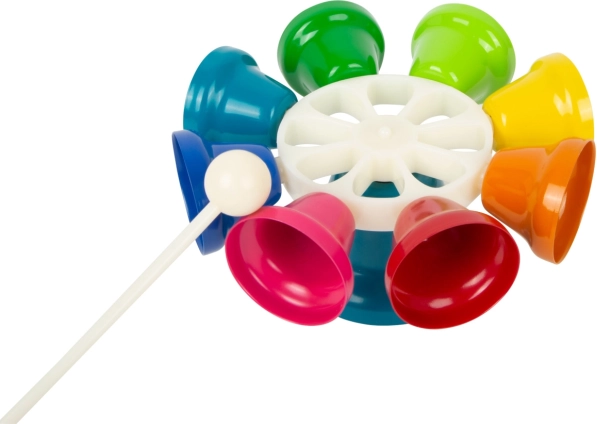 Con la bacchetta bianca inclusa i bambini possono battere facilmente ritmo e melodia. I campanelli possono essere suonati sul supporto oppure tenuti in mano.
