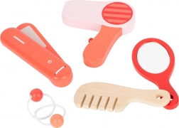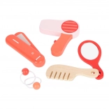 Contiene 12 pezzi di accessori tra cui pettine, specchio, phon e altri strumenti cosmetici.